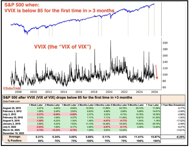 Sempre Subutrade ha notato che la volatilità del Vix è scesa rapidamente ed è tornata sotto 85 dopo oltre 3 mesi passati sopra. Il backtest mostra che le prospettive sono buone con un win ratio del 100% a 2 mesi e in generale sempre sopra il 75%.
