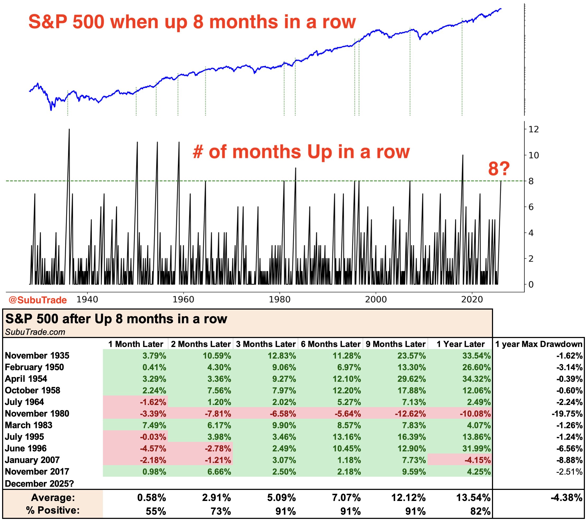 A metà seduta l’S&P 500 cede circa un decimale. Al momento l’indice generale guadagna lo 0.75% per il mese di dicembre, e quindi tra stasera e domani può succedere ancora di tutto. Ma supponendo che si mantenga positivo per Dicembre, questo sarebbe per l’S&P 500 l’ottavo mese positivo consecutivo. Per quanto la serie possa sembrare iperestesa, la statistica (sempre Subutrade.com) mostra che questo tipo di serie ha portato a una performance random nel primo e secondo mese, ma poi win ratio elevati e buone performance fino a un anno dopo. Solo il 1980 è stato consistentemente negativo.