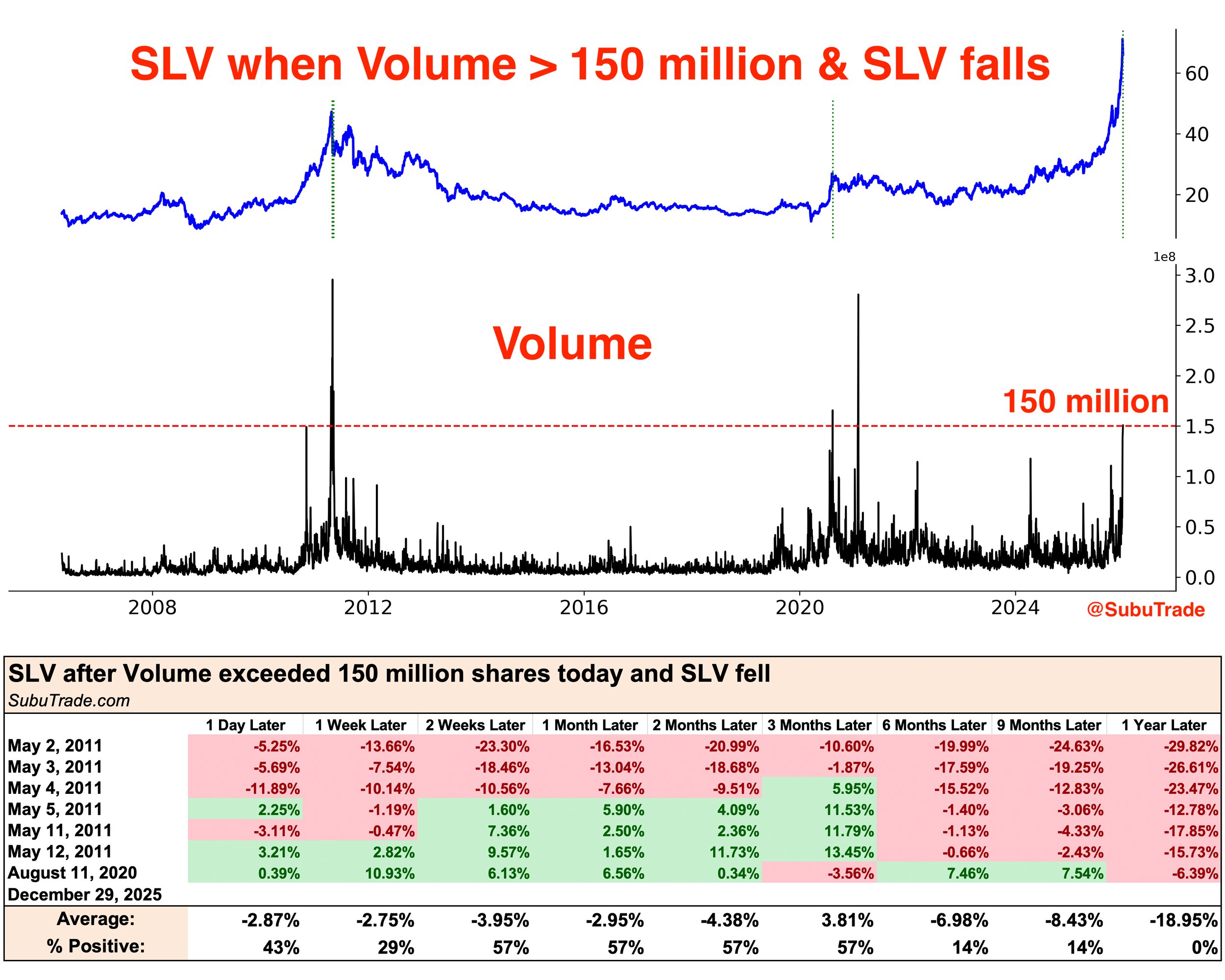 Chiusura moderatamente negativa per New York ieri sera (lunedì), con l’S&P 500 in calo dello 0.35%. Peggio di lui hanno fatto Nasdaq 100 (-0.46%) Russell 2.000 Small Cap (-0.57%), Magnificent 7 (- 0.81%). Coerentemente l’S&P 500 equal weight ha fatto meglio (-0.19%), con le mid cap che sono tornate ad outperformare leggermente. Se i rendimenti sono calati leggermente e il Dollaro è rimasto davvero stabile, i metalli preziosi hanno chiuso vicino ai minimi, con un calo del 9% per l’argento, che era stato in progresso del 7% alle prime battute, e del 4.4% per l’oro. Nel pezzo di ieri ho citato varie statistiche relative al movimento dell’argento, giungendo alla conclusione che un rimbalzo era possibile, magari anche con potenziale arrivo dalle parti dei massimi, ma che, a mio modo di vedere, per nuovi massimi significativi, se mai raggiunti, sarebbe occorsa una fase di consolidamento abbastanza lunga. Oggi Subutrade.com aggiunge un’altra statistica: quando l’argento è calato significativamente in una seduta con volumi record, siamo stati in prossimità di un massimo.