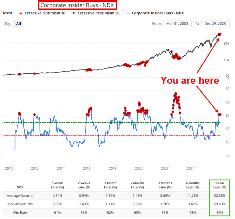Sistemata la statistica, vi è un altro indizio di buone performance per il 2026. Sentimentrader.com ha osservato che gli insider del Nasdaq (ovvero le prime linee delle aziende che lo compongono) stanno continuando a comprare azioni proprie molto di più di quanto le vendono. Questo comportamento ha portato a performance assai positive in particolare 12 mesi dopo.