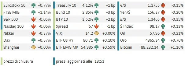 L’azionario continentale però ha continuato ad accumulare progressi, con Financials, Energy, Information Technology, Industrials e Consumer Discretionary a trainare, e nessun settore a mostrare cali. I principali indici chiudono con buoni progressi: l’Eurostoxx 50 fa il nuovo massimo storico a ridosso dei 5800 punti, Lo Stoxx 600 anche, il Ftse Mib fa i massimi dal 2.000, salendo nel durante sopra i 45.000 punti, l’Ibex anche lui al nuovo record. Nuovi massimi storici anche per Londra. Niente male come chiusura d’anno!