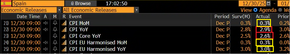 La seduta europea, in sostanza l’ultima del 2025, visto che domani Germania (che oggi fa mezza giornata), Italia, Austria, Danimarca, Finlandia , Norvegia, Svezia, Svizzera ed altre sono chiuse, e Francia, Spagna e UK fanno metà seduta, è partita con un tono costruttivo, cosa che ha impattato sui bonds, che hanno visto i rendimenti salire fino dalle prime battute. Eventualmente anche il CPI spagnolo preliminare di dicembre, con il dato non armonizzato leggermente sopra attese, ha contribuito a questi rialzi.