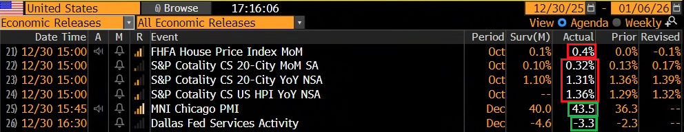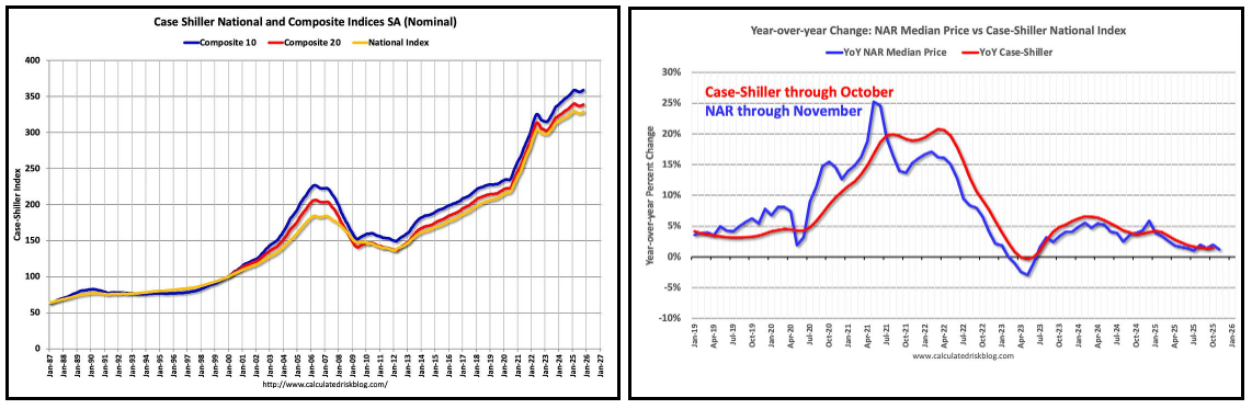 Il report Case Shiller di ottobre (prezzi delle case di agosto settembre e ottobre) mostra un incremento per il terzo mese consecutivo (dopo 5 di calo) e in accelerazione. Un +1.4% anno su anno non è forte come aumento, anzi, ma la discesa si è fermata, e comunque i prezzi delle case sono altissimi e si nota quindi una certa recente resilienza, forse legata al calo dei Fed Funds e dei tassi dei mutui, nell’ambito di un trend che resta debole.