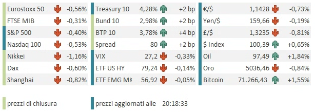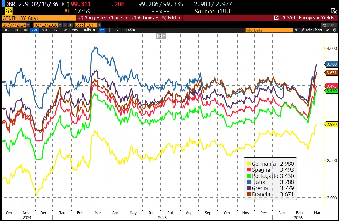 Un’altra seduta pesante ieri sera (giovedì) per Wall Street, con l’S&P 500 in calo dell’1.52% (minimo da novembre 2025), e il Nasdaq 100 a -1.73% (idem). Male anche le Magnificent 7 (-1.86%) e male le Small Caps (Russell  2.000 -2.12%). L’S&P 500 equal weighted ha perso esattamente quanto l’omologo capital weighted. WTI e Brent hanno guadagnato entrambi quasi il 10%,  con il secondo a chiudere sopra 100$, il che spiega gran parte, se non tutta, la risk adversion. D’altronde, le prime dichiarazioni di “Khamenei II” sono state che lo stretto resta chiuso (tranne per Cina e India) e che se gli attacchi continuano il fronte si allargherà. E Trump, vista l’impossibilità  di ottenere una capitulation rapida dell’Iran, ha dichiarato che l’eliminazione della minaccia nucleare è più importante del prezzo dell’oil (vedremo fino a quando). Un petrolio così forte ha importo dazio anche ai rendimenti, col 2 anni USA salito di 9 bps al 3.75%, massimo da agosto scorso, prima che la  Fed riprendesse a tagliare i tassi in autunno.