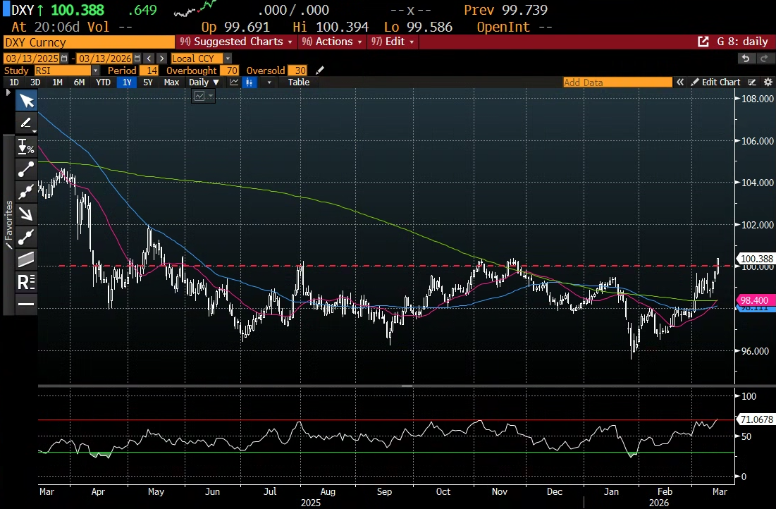 Discorso analogo per l’€  che oggi rompe al ribasso quota 1.15 vs un Dollaro sostenuto dalla risk adversion, esaltata da un positioning che era assai scarico (ora lo è meno, sicuramente). Il Dollar Index supera di slancio quota 100, marcando i massimi da aprile 2025