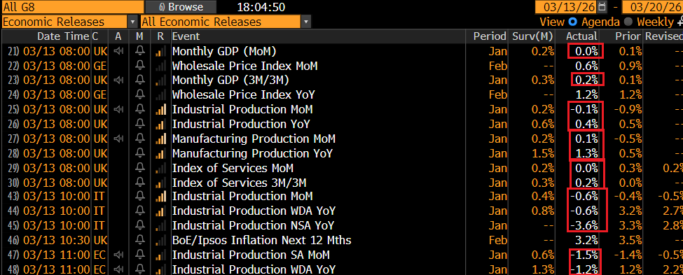 Male i dati macro UK mensili di gennaio, male la produzione industriale di gennaio, e male anche quella europea. Nulla di particolarmente rilevante, ma comunque a febbraio bisogna fare meglio.