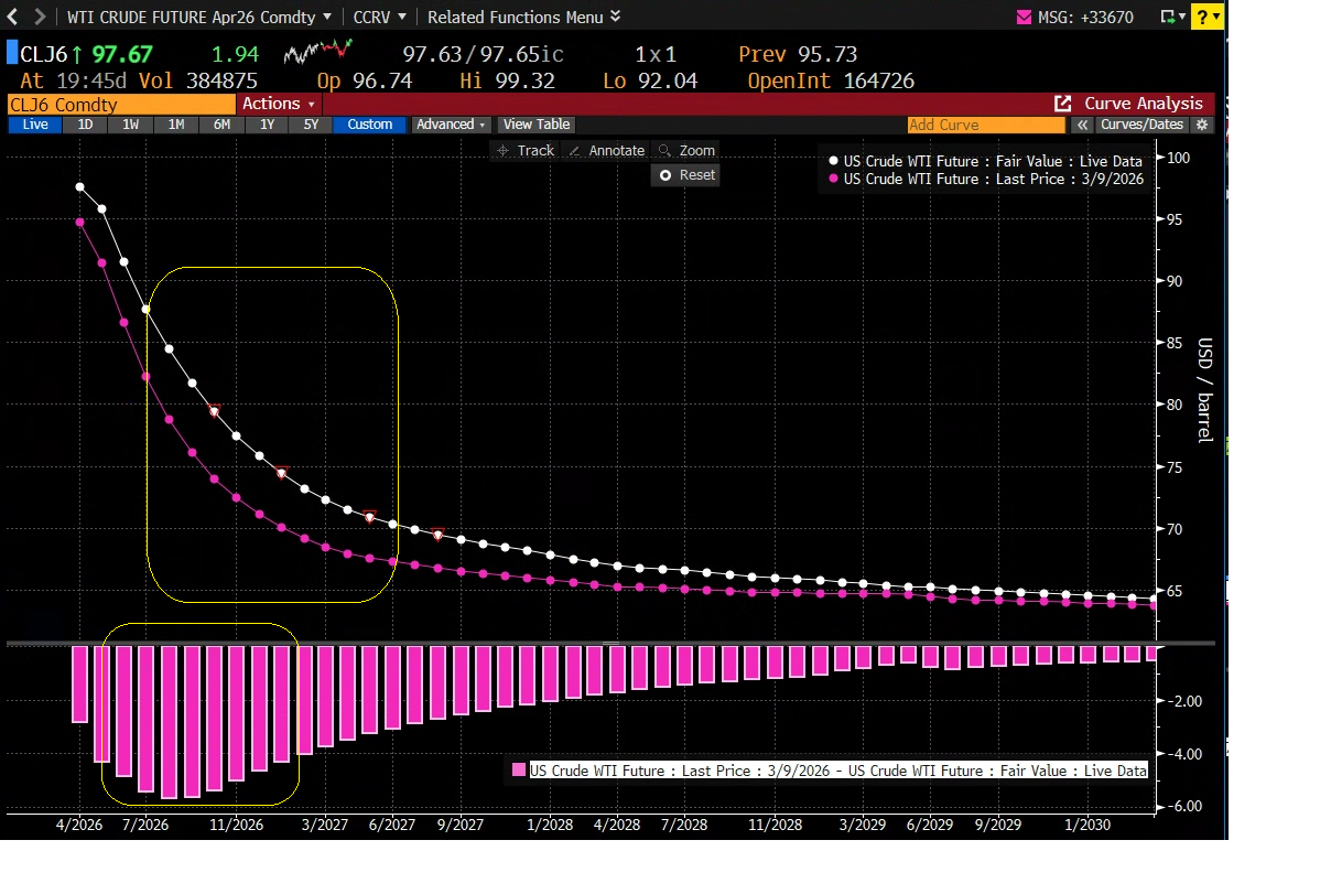 La verità è che comunque il mercato sta perdendo fiducia in una rapida risoluzione, col passare del tempo senza intravedere una svolta. Non a caso, sul future del WTI le scadenze dei trimestri centrali del 2026 sono salite di più negli ultimi giorni, rispetto a quella più ravvicinata. Lo si vede dal fatto che la curva odierna cala meno repentinamente di quella di lunedì