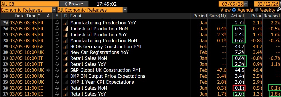 La seduta europea è partita con un clima un po’ nervoso dopo il rimbalzo di ieri, l’ orecchio teso alle notizie che venivano dal medio oriente. Oggi non c’erano dati rilevanti in EU, anche se comunque distrarre l’attenzione dalla geopolitica sarebbe stato difficile. La produzione industriale francese di gennaio è uscita in linea, le retail sales italiane di gennaio sono rimbalzate, e quelle EU hanno deluso, ma quelle di dicembre sono stati riviste pesantemente al rialzo, secondo l’ormai noto pattern.