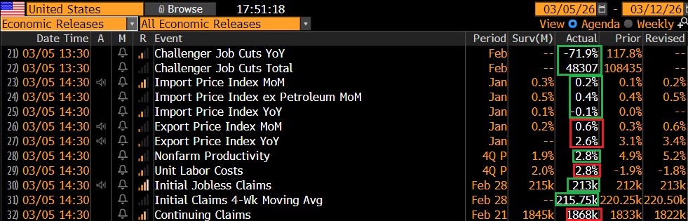 I challenger job cuts di febbraio sono calati del 72% anno su anno, ma anche del 55% rispetto a gennaio. E i hiring plans sono aumentati del 140% rispetto a gennaio. I sussidi settimanali sono rimasti bassi e sono usciti in linea con le attese. Non sembra davvero un mercato del lavoro in sofferenza di recente. Vediamo cosa ci dirà domani il Bureau of labour statistics. Produttività e costo del lavoro che escono entrambi sopra attese denunciano problemi nel consenso degli analisti. A parte ciò la produttività ha rallentato la crescita nel quarto trimestre 2025 e il costo del lavoro ha accelerato.
