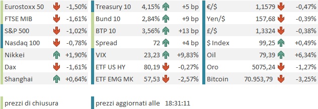 Per il momento le aperture alle trattative trapelate ieri sono rimaste lettera morta, mentre il newsflow tambureggiante fa toccare con mano i problemi legati al blocco dello stretto di Hormuz e anche il fatto che la tattica dell’ Iran di colpire tutti i paesi limitrofi stia pagando in termini di disagi e pressioni. C’è poi la novità che a finire le armi (di interdizione, ok) sembrano essere gli “alleati” mentre l’Iran dispone di sempre meno missili, ma appare avere buone scorte di droni kamikaze che possono andare a colpire a 1000 km dal punto di lancio, e quindi creare danni in una vasta area. L’inaspettata resilienza iraniana lascia intendere una guerra più lunga, con ovvii risvolti su petrolio, gas, energia e commercio. Di qui il rapido test dei minimi in Europa e la debolezza in US.