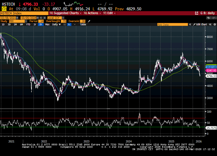Più tranquille Taiwan e Tokyo, attorno al +2%. Jakarta e Mumbai hanno recuperato un 1% abbondante, e invece Sydney mezzo punto, mentre Vietnam è calato, ma ieri era stata l’unica borsa a salire. Per quanto riguarda il China Complex, buone performance dalle “A” shares, mentre Hong Kong ha progredito in maniera modesta, e HSCEI è invece calata ancora, zavorrata dal tech, che continua a scendere. L’indice Hang Seng Tech è giunto ad una manciata di punti percentuali dai minimi segnati all’indomani del liberation day. E’ ipervenduto a livelli che in passato hanno prodotto rimbalzi decenti.