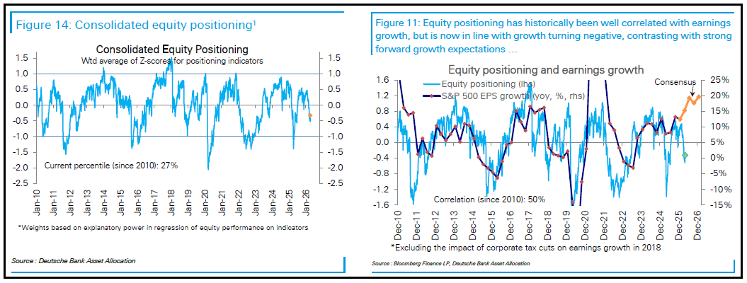 Se queste news hanno fornito le motivazioni, un buon supporto è arrivato dal positioning, che, nonostante un moderato recupero, resta molto cauto e scarico, e quindi rende il mercato sensibile oltremodo alle good news. Il report di Deutsche Bank (relativo alla scorsa settimana) ha mostrato un aumento di peso, ma un positioning sempre nel 27mo percentile. Ed ha evidenziato ancora una volta che il positioning, che normalmente è ben correlato con l’earning growth attesa, ha aperto un crescente gap e attualmente sembra coerente con un earning growth nulla o leggermente negativa (figur a a destra).