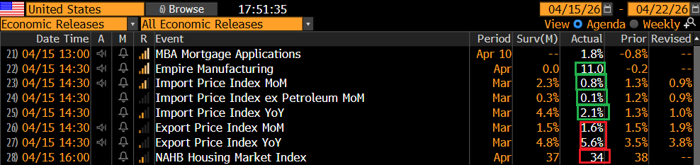 La seduta europea è partita con un tono moderatamente consolidativo oggi. D’altronde il petrolio è rimasto stabile nonostante il continuo filtrare di news sulle trattative, sulla possibilità di nuovi incontri a breve, e le dichiarazioni ultra ottimiste di Trump e Vance. La resilienza del petrolio ha fermato anche il rimbalzo dei bonds, mentre l’€ è rimasto in area 1.18. Anche oggi in Europa non c’erano dati particolarmente rilevanti. Negli USA c’era qualcosa in più: l’Empire manufacturing ha fatto meglio delle attese, gli import prices di marzo sono usciti benigni, e con revisioni al ribasso a gennaio (vedi quanto detto ieri sui dazi) e però il sentiment dei costruttori è ulteriormente collassato sotto i colpi dei tassi in rialzo.