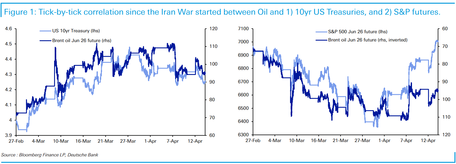 I rendimenti treasury rimbalzano, e a differenza delle borse non sono ancora nemmeno riusciti a ritracciare la metà del rialzo dei rendimento. A tale proposito è interessante questo grafico di Deutsche Bank che mostra come l’azionario habbia rotto la correlazione con il petrolio (perchè ha in mente gli earnings, e patisce il positioning difensivo) mentre i rendimenti la abbiano sostanzialmente mantenuta. Direi che è qui che nel breve c’è ancora un poò di valore, in caso di una risoluzione della crisi.