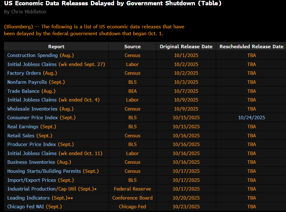 Come di recente, qualunque dato fosse previsto oggi in US è stato sospeso dallo shutdown. Ormai, come si vede da questo screen Bloomberg, la lista dei dati rimasti indietro è piuttosto lunga. Ma come mostra lo schema, il CPI di settembre verrà pubblicato (in ritardo), il 24 ottobre, per permettere di aggiornare le pensioni e altri pagamenti di welfare.