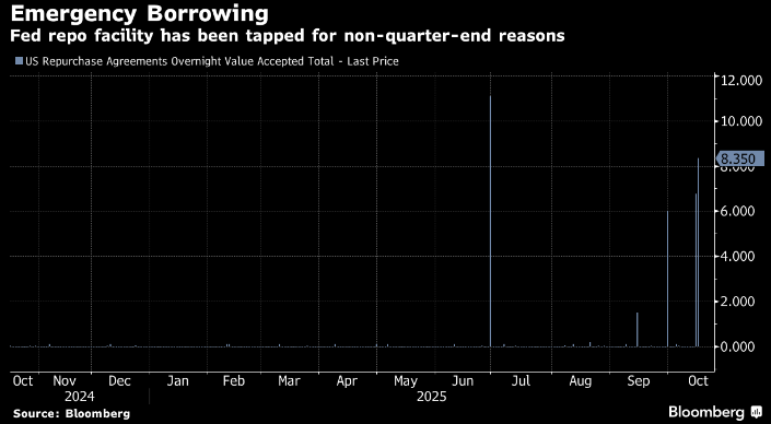 Aggiungiamoci che la Fed Repo Facility, lo schema creato dalla Fed per dare liquidità alle banche in cambio di asset, allo scopo di coprire estemporanee esigenze di liquidità, dopo essere stata in totale disuso post Covid e, nel 2025 avere visto prelievi solo a fine trimestre e in occasione del pagamento delle tasse (classiche scadenze in cui le banche hanno bisogno di liquidità), improvvisamente da 2 giorni sta vedendo vistosi incrementi di utilizzo, e il sospetto viene che la liquidità si stia un po’ ritirando. Un fenomeno che di solito è sintomo quantomeno di stress, e, a volte, di problemi bancari. Non a caso, i nomi delle banche che attingono non vengono resi pubblici, per evitare lo stigma, di “banca in crisi” con connesse corse allo sportello etc etc.