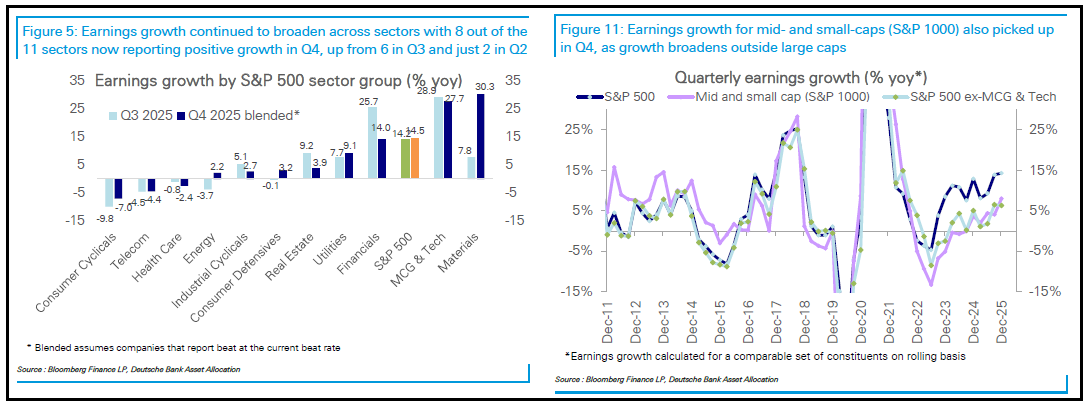 E l’earning growth si è estesa ad ancora più settori, 8 su 11 contro i 6 del terzo trimestre 2025. Il bello è che la crescita degli utili del tech e delle mega cap continua a essere fortissima, a quasi il 28%, superata solo dal balzo di quella dei materials. E quella delle mid e small cap ha accelerato, andando a giustificare la recente outperformance.