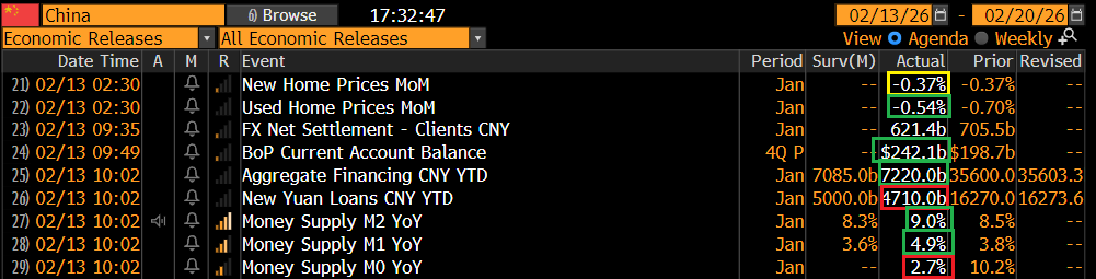 I dati macro hanno riguardato principalmente la Cina, con i prezzi delle casse nuove che continuano a calare a gennaio, ma con un nuovo modesto rallentamento di quelli delle case usate. Il surplus commerciale del quarto trimestre è aumentato, in barba ai dazi di Trump.