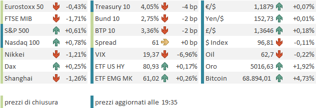 Le piazze europee non si sono fatte troppo illudere, vista anche la debacle di ieri sera da parte di Wall Street, e chiudono con perdite moderate per l’Eurostoxx 50 e Cac 40, marginali per lo Stxx 600, aiutato da Londra che continua ad outperformare, visto che non ha quasi tech. Male Milano e Madrid, frenate dal settore bancario oggi in decisa disgrazia per motivi non chiarissimi. I rendimenti Europei hanno mantenuto i cali, mentre i cambi sono rimasti stabili. Tra le commodities resiste il rimbalzo dei preziosi, debole il petrolio che accusa l’apparente miglioramento del dialogo tra Israele, USA e Iran. Ma io non mi fiderei troppo.