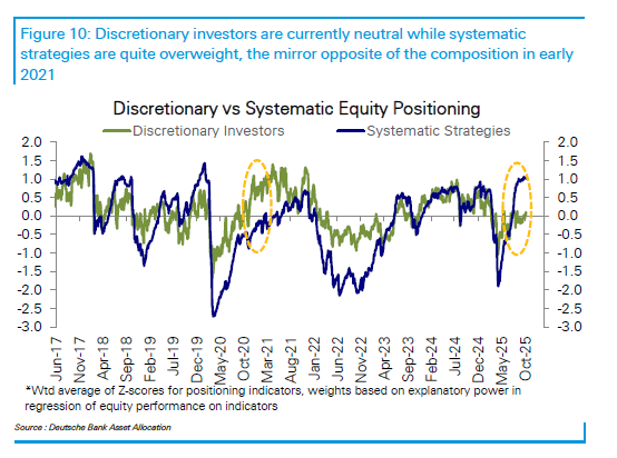 Al suo interno però troviamo una situazione peculiare: mentre gli investitori istituzionali non si sono fatti troppo trascinare e sono fondamentalmente neutrali (51mo percentile), le strategie sistematiche sono sovrappesate ai massimi dal 2019 e al 92mo percentile. Questo implica che i discrezionali hanno spazio per aumentare. Ma se non lo hanno fatto finora, lo faranno adesso, con i temi sopra indicati che incombono?