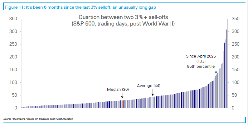 Sono inoltre 133 giorni che non abbiamo una correzione del 3% nell’S&P 500, non di certo un record, ma nel 95mo percentile come lunghezza del periodo, mentre la mediana è di 30 giorni e la media di 44.