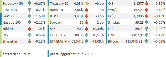 Considerando il momentum che ha il mercato USA, le fissazioni per l’AI, i semis l’energia elettrica, il quantum computing etc, che Wall Street avrebbe messo a segno un bel rimbalzo alla minima buona notizia era abbastanza scontato.  E di notizie positive ce n’è stata più d’una, mentre il fixed income chiuso ha evitato che il credito eventualmente arrivasse a frenare gli entusiasmi. Detto questo, come osservato in cima al pezzo, non è che ci sia scarsità di potenziali focolai di tensione.