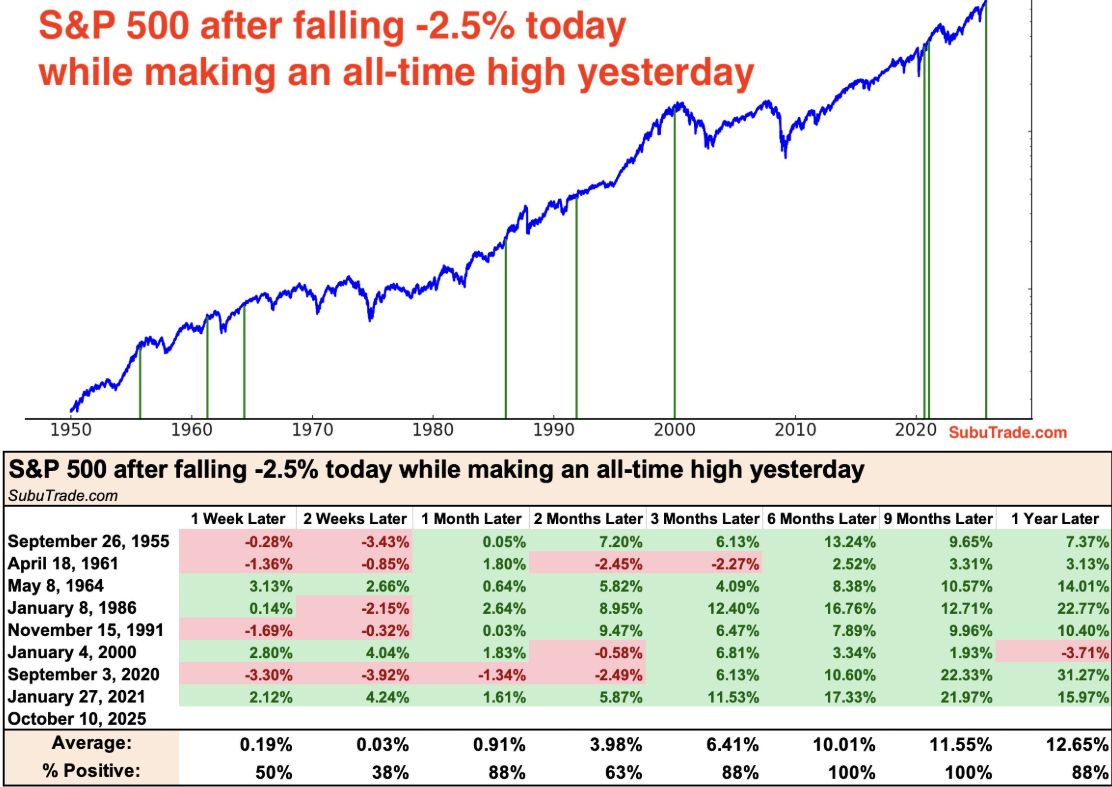 Peraltro, vale la pena di osservare che la price action che abbiamo visto venerdì, ovvero un massimo storico nel durante seguito da una chiusura in passivo di oltre il 2.5%, non è tipica dei top, Nello schema sotto sono raffigurati tutti i casi in cui questo è successo, e il backtest mostra che, si, nelle 2 settimane successive la performance dell’S&P 500 è stata sotto la media. Ma da 3 mesi in avanti i casi di performance negative sono rari.