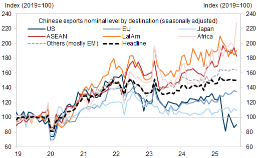 Nel dettaglio, si nota che ironicamente, visti gli ultimi eventi, la sorpresa in export dipende da un rimbalzo di quello verso gli USA, e America latina, mentre quello verso EU e Asia ha ceduto leggermente, pur restando in un trend di crescita che mostra come la Cina stia trovando destinazioni alternative agli SUA.
