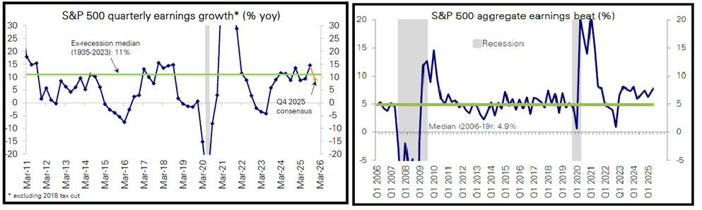 L’earning growth dell’S&P 500 è stata egregia negli ultimi 8 trimestri, attorno al 10% anno su anno di media il che è stato a mio parere il principale fattore dietro alla performance dell’indice. Nel terzo trimestre 2025 abbiamo assistito ad un accelerazione al 15% e allargamento della crescita, che prima era confinata a tech e finanziari ad altri settori. I fattori che hanno favorito questa accelerazione, ovvero easing monetario, deregulation, aumento della produttività per adozione AI, sono stati al lavoro anche nel quarto trimestre, e nel 2026 vi si aggiungerà un ulteriore easing fiscale, e probabilmente una politica monetaria più espansiva del necessario. Al momento non c’è motivo di pensare che l’earning growth rallenti.