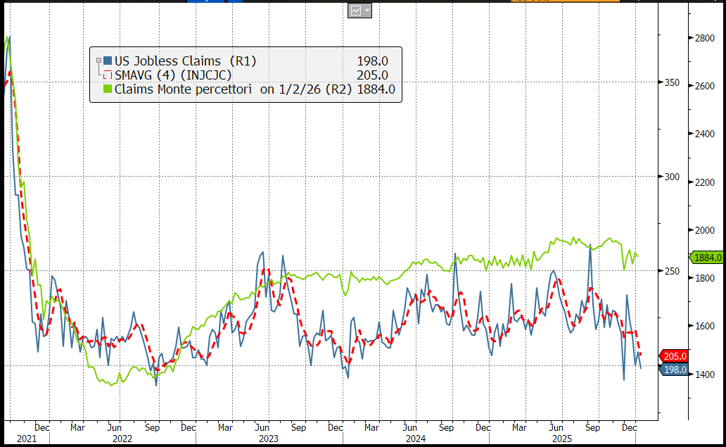 I sussidi di disoccupazione sono usciti sotto attese, e sotto 200.ooo unità, quindi bassissimi. Però la settimana scorsa presenta ancora un tema di destagionalizzazione, che forse ha esaltato il calo. Detto questo, i claims continuano a indicare un mercato del lavoro USA stabile. In questa serie ancora la debolezza non si vede.