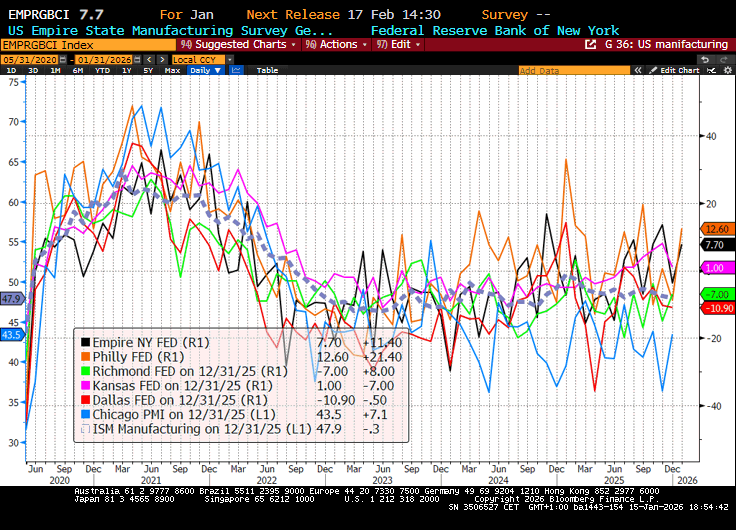 Empire manufacturing e Philly Fed hanno sorpreso in positivo, e sono tornati a segnalare crescita per il manifatturiero nei rispettivi distretti a gennaio. Queste survey regionali di recente sono diventate troppo volatili, per dare segnali validi sull’attività manifatturiera. Si nota molto bene nel grafico sotto dove la sostanziale correlazione del 2021- 22 si sostituisce la confusione totale del 2024-25.